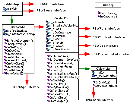 This class supports both the IPSWAddIn and IPSWEvents interfaces. During the initial IPSWAddIn::OnConnection event, CAddinImpl creates an instance of the CAddonMain class. Subsequent messages from PS/Workshop are passed to this encapsulated CAddonMain object.